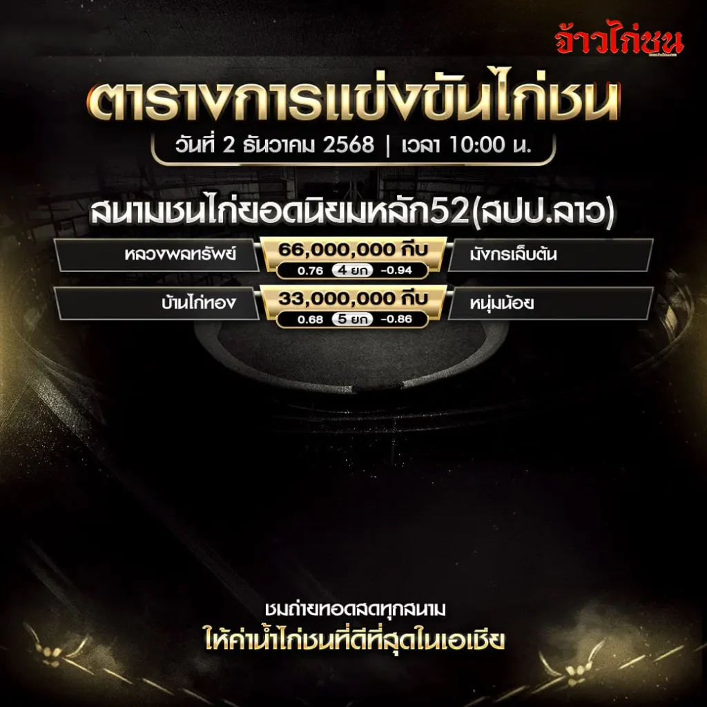 ตารางแข่งขันไก่ชนสนามยอดนิยมหลัก52 (สปป.ลาว) ประจำวันที่ 2 ธันวาคม 2568 เริ่มแข่งเวลา 10:00 น. รวมสองคู่เงินก้อนโต 66 ล้าน และ 33 ล้าน พร้อมเรตน้ำและจำนวนยกครบ เหมาะสำหรับแฟนไก่ชนที่อยากเช็กโปรแกรมก่อนดูถ่ายทอดสด