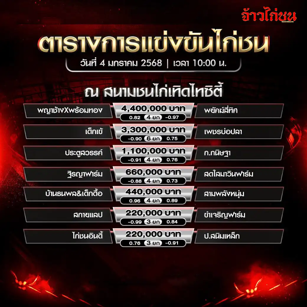 การรู้ โปรแกรมไก่ชนวันนี้ ช่วยให้ไม่พลาดคู่สำคัญของแต่ละสนาม รู้ว่าเป็นคู่เอก คู่รอง หรือคู่ประกอบรายการอะไรบ้าง และวางแผนติดตามได้เป็นระบบ ไม่ว่าจะเป็นการดูถ่ายทอดสด ดูตัวก่อนขึ้นสังเวียน หรืออ่านวิเคราะห์ก่อนชน