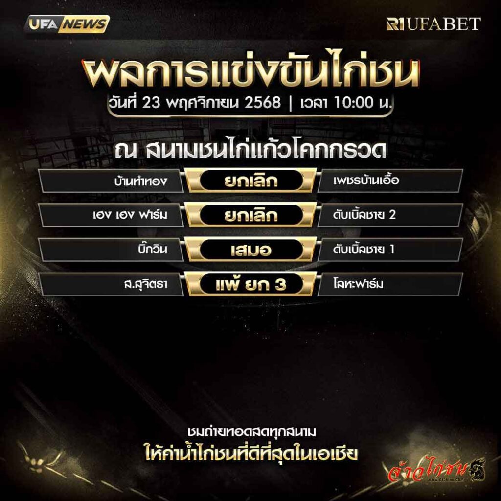 ผลการแข่งขันไก่ชน สนามแก้วโคกกรวด วันที่ 23 พฤศจิกายน 2568