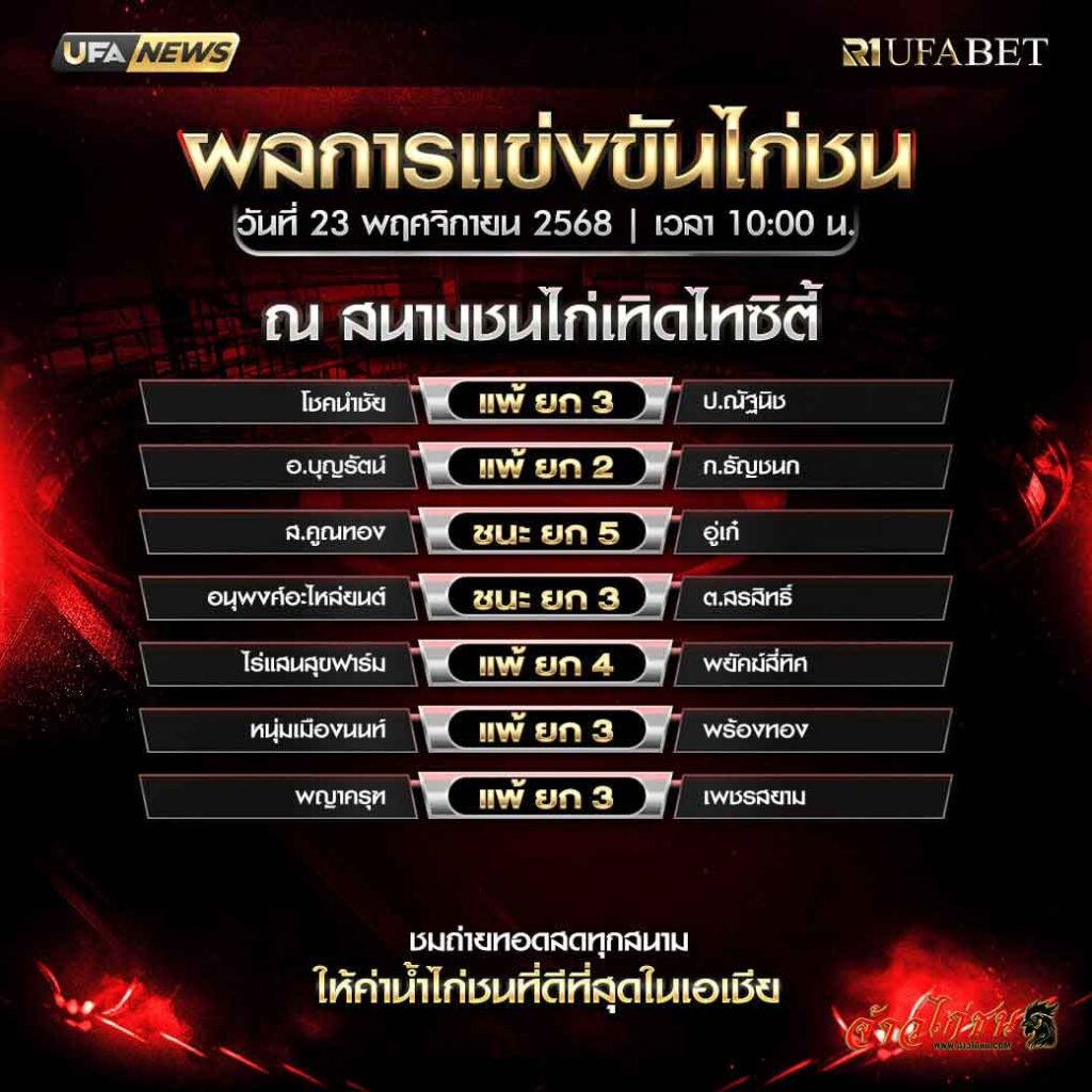 ผลการแข่งขันไก่ชน สนามเทิดไทซิตี้ วันที่ 23 พฤศจิกายน 2568