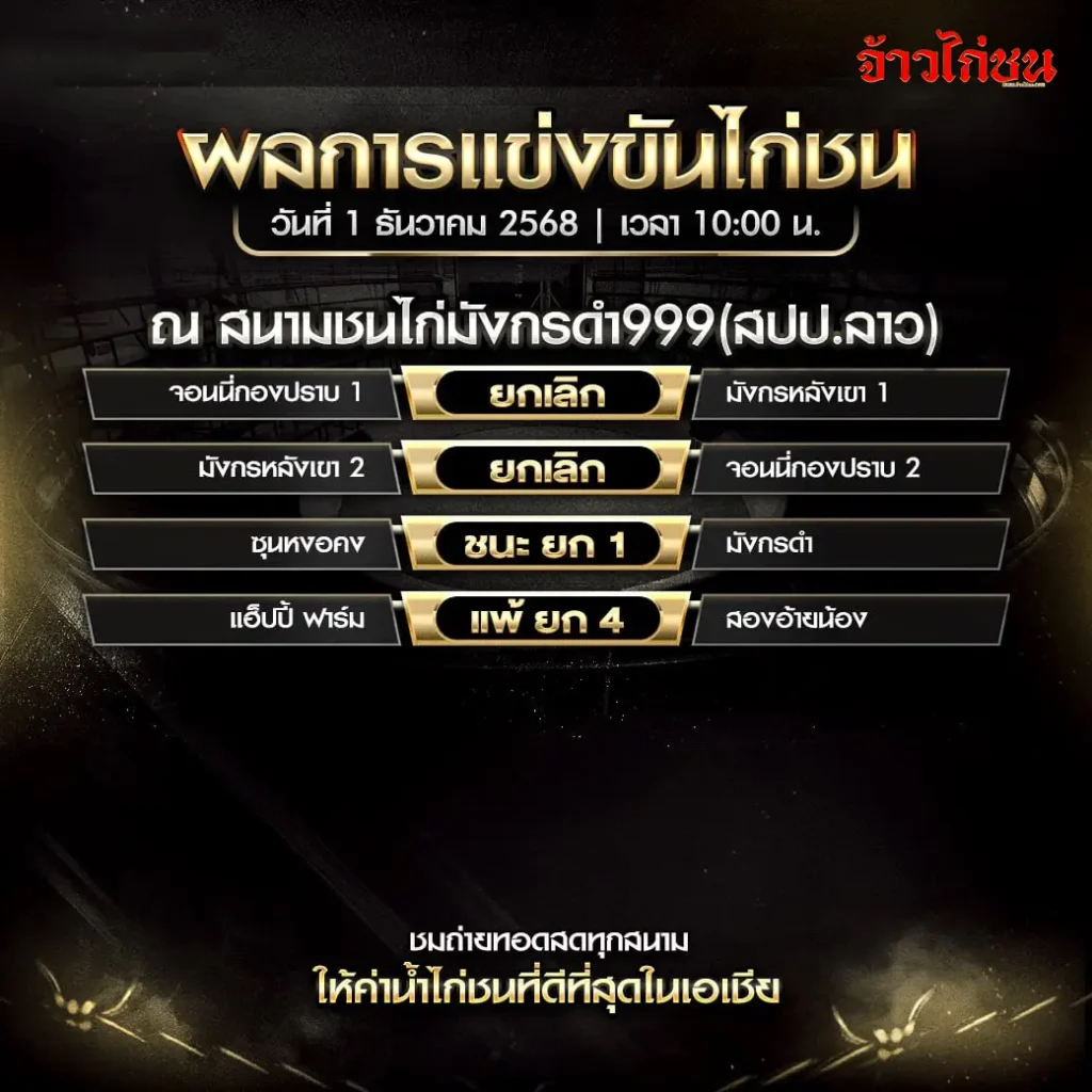 ผลไก่ชนวันนี้ สนามมังกรดำ999 (สปป.ลาว) วันที่ 1 ธันวาคม 2568 อัปเดตล่าสุด