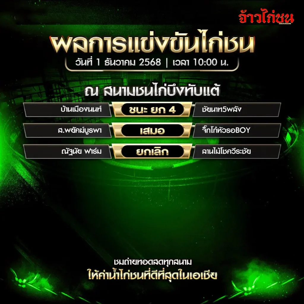 ผลไก่ชนวันนี้ สนามบึงทับแต้ วันที่ 1 ธันวาคม 2568 – สรุปครบทุกคู่