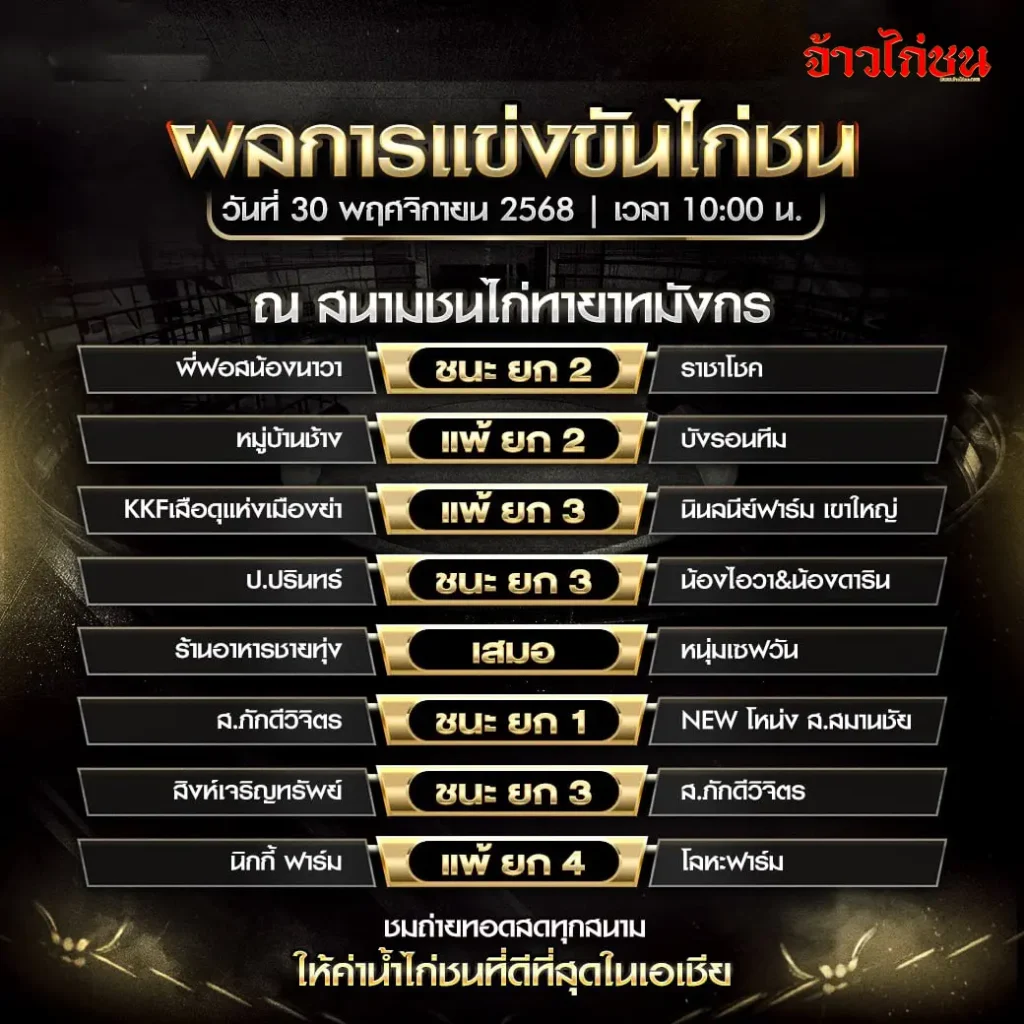 ผลการแข่งขันไก่ชน สนามท่ายายนังกร วันที่ 30 พฤศจิกายน 2568 (อัปเดตล่าสุด)