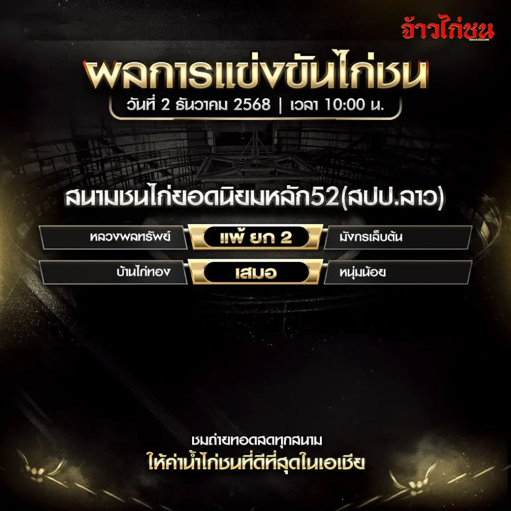 ผลไก่ชนวันนี้ สนามยอดนิยมหลัก52 (สปป.ลาว) วันที่ 2 ธันวาคม 2568 – สรุปครบทุกคู่