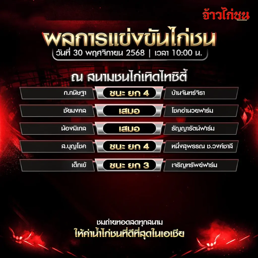 ผลการแข่งขันไก่ชนล่าสุด สนามเทิดไทซิตี้ วันที่ 30 พฤศจิกายน 2568 (ครบทุกคู่)