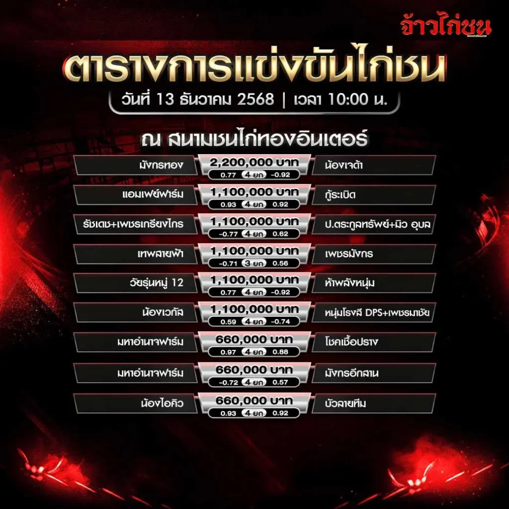 ตารางแข่งขันไก่ชน สนามไก่ทองอินเตอร์ วันที่ 13 ธันวาคม 2568