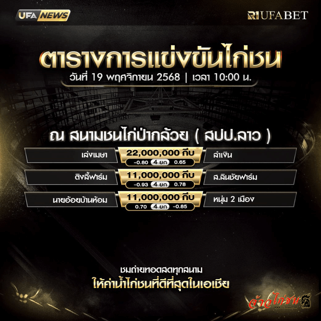 ตารางการแข่งขันไก่ชน สนามบ้านเกิน (สปป.ลาว) วันที่ 20 พฤศจิกายน 2568 — ศึกเงินล้านกว่า 110 ล้านกีบ